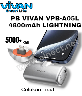 Terdapat 2 pilihan : - VPB-A05L (Konektor Lightning) - VPB-A05C (Konektor Type-C) FITUR UTAMA : ? Super Mini Powerbank sebesar lipstik ? Foldable Plug, colokan yang dapat ditekuk lebih simple. ? Flight Friendly, dapat dibawa kedalam kabin pesawat ? Kapasitas 4800 mAh Isi Kemasan : 1x VIVAN VPB-A05 Mini Powerbank 4800mAh