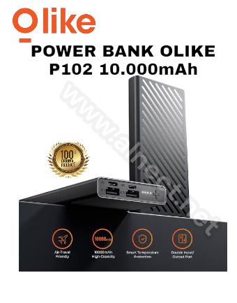 Spesifikasi: Brand : OLIKE Item e: P102 Color : Black Capacity : 10.000mAh Type-c Input : 5V/2A Micro USB Input : 5V/2A USB 1 Output : 5V/2.1A Max USB 2 Output : 5V/2.1A Max In The Box: 1 x OLIKE P102 Powerbank 10000mAh