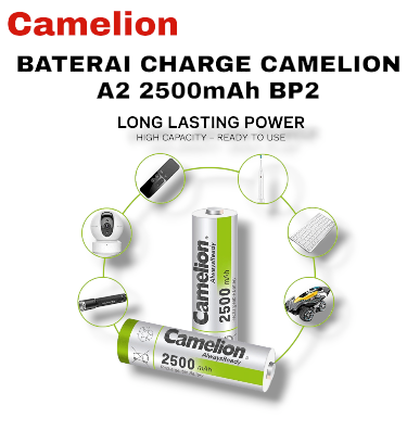 Camelion Memproduksi beragam Baterai Primary (Baterai Alkaline - Super Heavy Duty - Ekstra Heavy Duty - Lithium - Button Cell), Baterai Rechargeable, Senter, Jump Starter, dan Aksesoris Mobile lainnya. Yang telah Didistribusikan di berbagai Negara dan kini hadir di Indonesia !     Camelion A2 2500 mAh BP2 Packing : isi 2 Pcs Baterai Ukuran : 1.2V | AA | A2 Kapasitas : 2500 mAh Jenis : Baterai Isi Ulang Always Ready