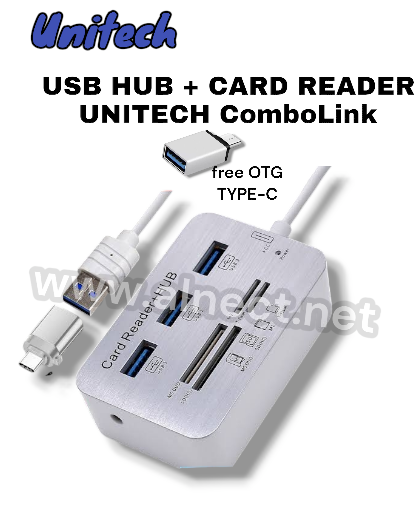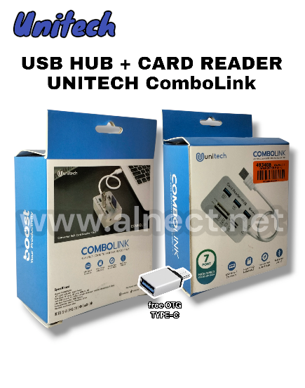 USB HUB CONVERTER TYPE C HUB 3.0 + CARD READER | 7 IN 1 - COMBOLINK | UNITECH --- ComboLink adalah USB HUB converter 7 in 1 dari Unitech yang juga berfungsi sebagai Card Reader. Kecepatan transfer data dengan USB 3.0 pada ComboLink mencapai 5GB/s. USB 3.0 ComboLink Converter Unitech menggunakan teknologi USB 3.0 sehingga kecepatan pemindahan data mencapai 5GB/s. 7 in 1 ComboLink Converter Unitech memiliki fitur 7 in 1, yaitu: 3x USB 3.0 Port, 1x MS Duo Port, 1x M2 Port, 1x SD Card Port, 1x T-Flash. High Quality Material ComboLink Converter Unitech terbuat dari bahan Aluminium Alloy sehingga lebih awet dan dapat digunakan dalam jangka panjang. Free Type C Hub ComboLink Converter Unitech sudah dilengkapi dengan Type C Hub sehingga dapat disambungkan ke gadget mana pun yang memiliki port Type C. Plug N Use ComboLink Converter Unitech hanya perlu dicolok untuk digunakan, tidak perlu install apapun. 12 Months Warranty Semua produk Unitech Official Store garansi 12 bulan. Silahkan hubungi CS untuk info lebih lanjut. Packing Aman & QC Semua pesanan yang dikirim Unitech Official Store dipastikan sudah dipacking dengan aman dan sudah melewati proses QC.