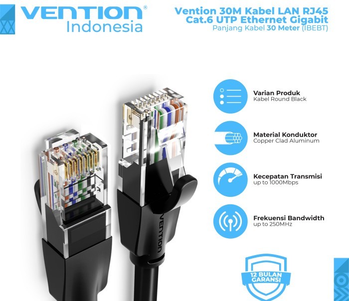 Spesifikasi Teknis : Brand : Vention Name : Cat.6 UTP Network Cable Model : IBEB Color : Black Interface : RJ45 Interface Process : Gold-plated Pins Transfer Bandwith : 250MHz Conductor : Copper Clad Aluminum Shielding : UTP Shell : PVC Jacket : PVC AWG : 26AWG OD : 5.5mm Length : 30M Warranty : 1 Year Packing : PE Bag