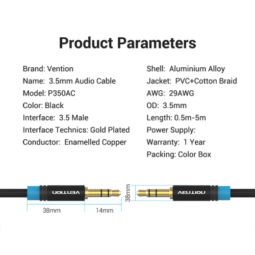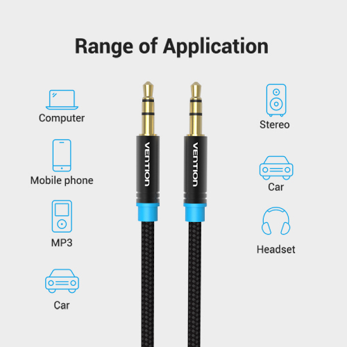 Audio Cable 3.5mm Male to Male Cotton Braided Black Vention [BAJ 0.5M] adalah kabel AUX berkualitas tinggi dengan desain premium berbahan cotton braided yang kuat dan tahan lama. Dilengkapi konektor berlapis emas 24K dan shell aluminium alloy untuk konduktivitas optimal serta daya tahan lebih lama. Dengan konduktor tembaga bebas oksigen, kabel ini memastikan transmisi audio jernih dan stabil. Fleksibel dengan desain anti-patah, menjadikannya ideal untuk berbagai perangkat audio.