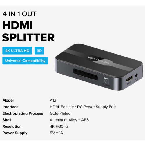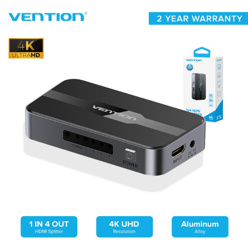 Vention HDMI Splitter 1 In 4 Out memungkinkan satu sumber HDMI untuk dibagi ke empat layar secara bersamaan tanpa kehilangan kualitas. Mendukung resolusi hingga 4K Full HD, ideal untuk home theater, presentasi bisnis, CCTV, dan penggunaan multi-display lainnya. Dilengkapi adaptor daya eksternal untuk stabilitas sinyal yang lebih baik dan kompatibel dengan berbagai perangkat HDMI seperti PC, laptop, TV box, PS4, Xbox, dan proyektor.