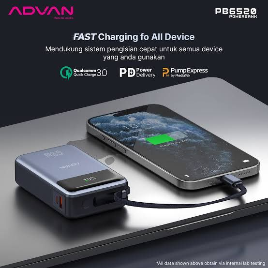 Advan Powerbank sudah mendukung Fast Charging up to 65W. Fitur ini memberikan efisiensi waktu bagi pengguna. Dengan fitur fast charging pengguna tidak perlu lagi khawatir ketika mengisi daya perangkat akan menyita waktu pengguna.