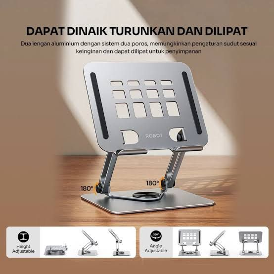Keunggulan : Dapat rotasi 360° yang dilengkapi alas putar di bagian bawah Sudut dan ketinggian dapat disesuaikan Terdapat dua gagang aluminium yang stabil dan kokoh, mampu menahan beban hingga 10kg Berbahan Baja Karbon untuk pendinginan lebih cepat Dapat dilipat untuk penyimpanan yang lebih mudah Kompatibel untuk tablet/notebook 12.8 inch