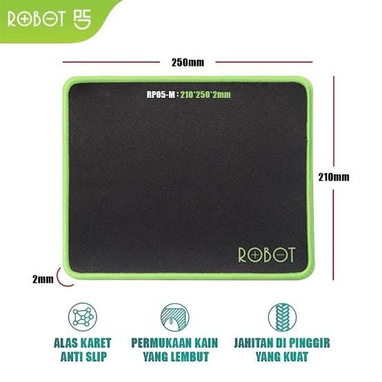 Spesifikasi: Brand Name : ROBOT Class Name : Gaming Mousepad Model : RP05 Goods color : Black Size: S : 180*220*2mm M : 210*250*2mm L : 230*280*2mm XL :230*640*2mm
