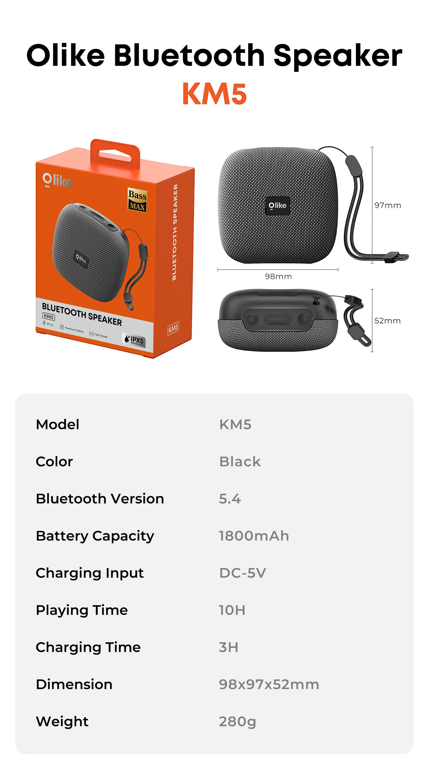 Olike KM5 Speaker Series TWS DUAL SPEAKER Connection Support Olike Speaker Bluetooth KM5 Bebas Bergerak, Musik Tetap Menggelegar Olike Speaker Bluetooth KM5 memeberikan pengalaman audio yang jernih dan bertenaga, speaker Bluetooth portabel yang siap menemani setiap aktivitasmu—baik di dalam maupun luar ruangan. Fitur Uggulan: - Desain Ringan & Praktis: Didesain dengan bodi yang ringan dan dilengkapi dengan clip lanyard, speaker KM5 mudah digantung di tas atau dibawa ke mana saja. Cocok untuk kamu yang aktif dan ingin menikmati musik dengan fleksibilitas tinggi. - Suara Stereo Ganda: Nikmati pengalaman audio yang lebih imersif dengan fitur koneksi dual speaker. Hubungkan dua unit KM5 untuk menghasilkan efek suara stereo surround yang mengesankan. - Output Bertenaga 5W: Dilengkapi dengan output 5 watt yang menghadirkan suara lantang dan jangkauan luas, KM5 memberikan kualitas audio yang memanjakan telinga, cocok untuk berbagai suasana. - Tahan Air IPX5: Dengan sertifikasi IPX5, speaker ini siap menemani kamu di berbagai kondisi, termasuk lingkungan lembap atau saat terkena cipratan air ringan. Ideal untuk petualangan outdoor atau penggunaan harian tanpa rasa khawatir.