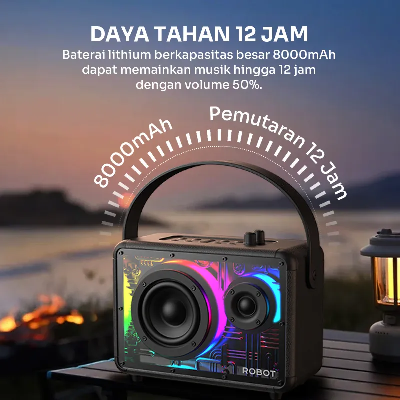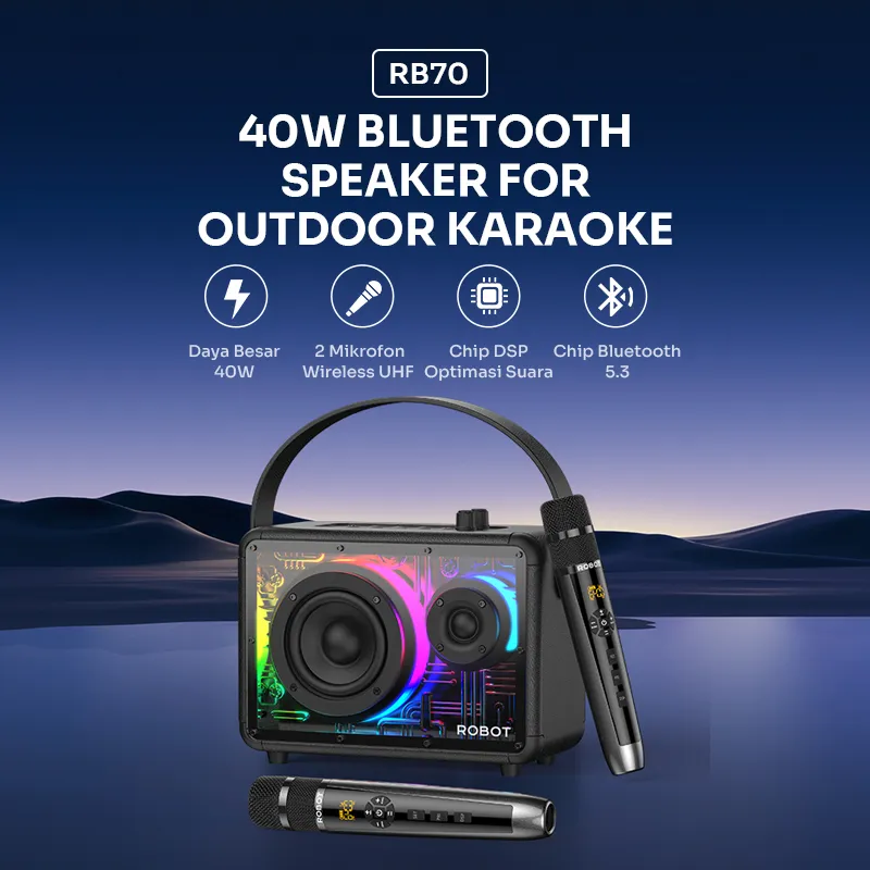 ROBOT Speaker Karaoke Outdoor RGB 40W RGB Bluetooth 5.3 With 2 Microphone Wireless UHF Speaker Super Bass Chip DSP RB70 Original - Garansi 1 Tahun   Keunggulan : 1. Daya 40W speaker super jernih dan stabil 2. Baterai 8000mAh, lama pemutaran musik hingga 12 jam 3. 2 Mikrofoon Nirkabel, Mikrofon Diafragma Besar dan Teknologi UHF untuk suara jernih dan stabil 4. Tiga mode pemutaran, True Wireless Stereo (TWS) Koneksi bluetooth 5.3, TF card, AUX Audio cable 5. Dapat menerima panggilan masuk 6. Lampu RGB LED mode yang dinamis dapat mengikuti irama musik 7. TWS interkoneksi, menghubungkan 2 speaker secara bersamaan, menciptakan suara stereo yang sebenarnya 8. Cocok umtuk acara outdoor, karaoke, dan live show