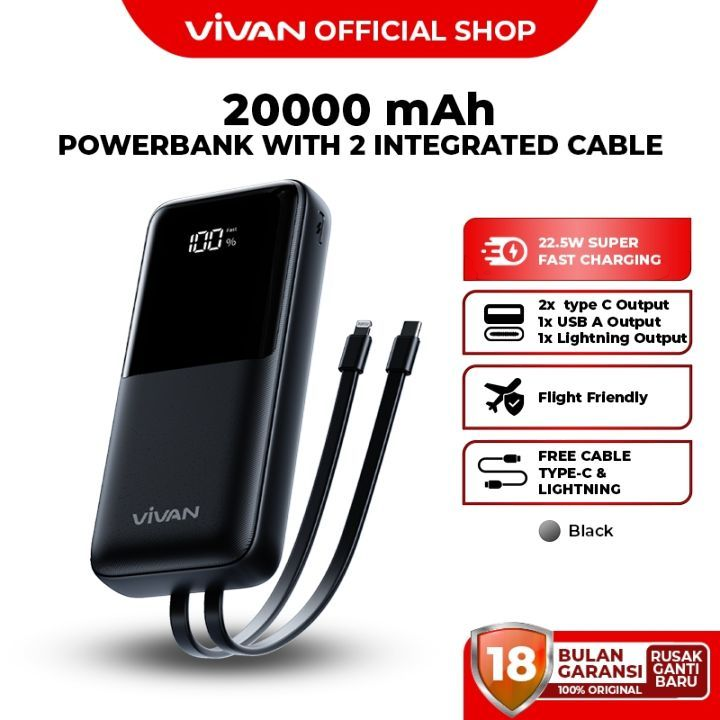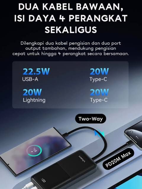 Keunggulan:   1. Super Fast Charging 22.5W Dapatkan pengisian daya super cepat dengan kecepatan hingga 22.5W untuk perangkat Anda.   2. Kapasitas 20000mAh: Daya besar untuk mengisi daya perangkat Anda lebih dari 4 kali, termasuk ponsel iPhone 15.   3. Dua Kabel Bawaan: Sudah dilengkapi dengan kabel Type-C dan Lightning untuk kenyamanan pengisian daya tanpa perlu membawa kabel tambahan.   4. Fitur Pengisian Dua Arah: Mendukung pengisian daya dua arah (input dan output) untuk kenyamanan maksimal.   5. Port USB-A dan USB-C: Menyediakan 3 input dan 4 output, kompatibel dengan berbagai perangkat.   6. Desain Ringan dan Portabel: Mudah dibawa kemana saja, ideal untuk perjalanan dan pengisian daya di luar ruangan.