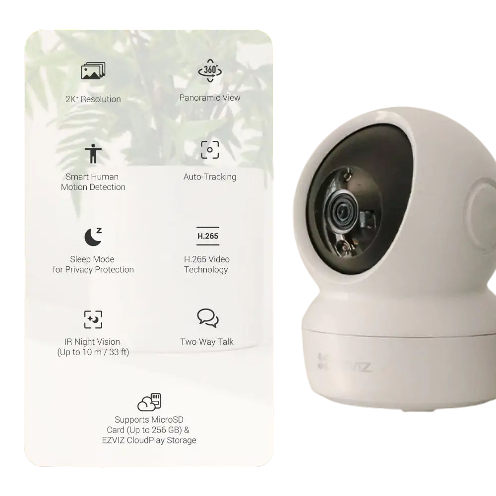Resolusi kamera 3MP 2304x1296 camera resolution Motorized Pan & Tilt for 360° Visual Coverage, Kamera pan-tilt dapat bergerak ke kiri-kanan atau atas bawah IR Night Vision (Up to 10m / 33ft), infrared untuk melihat dalam kondisi gelap Smart Human shape detction Auto Tracking, dapat mengikuti objek yang bergerak Two-Way Talk, kamera built-in microphone untuk mendengar suara sekeliling kamera, dan built in speaker untuk dapat mengeluarkan suara Sleep Mode for Privacy protection, mode privasi untuk privasi anda 2.4GHz, dapat bekerja dengan wifi 2.4GHz Support Micro SD Slot up to 512GB, dapat menggunakan memori micro sd hingga 512GB patrol mode kompresi H.265 Loud Noise detection