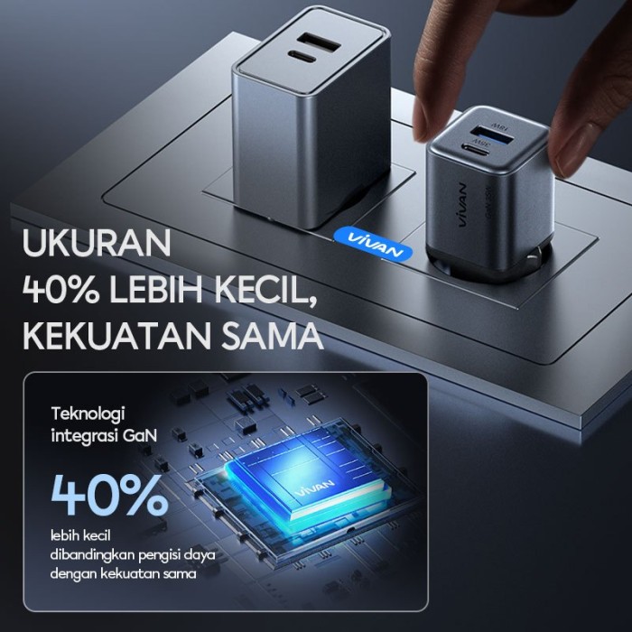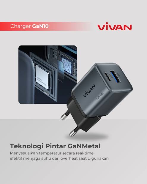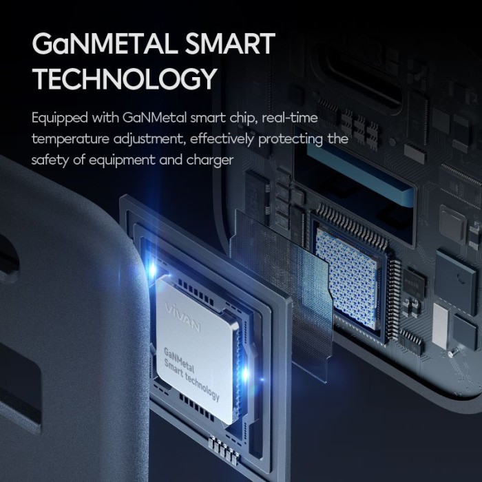 3. Menggunakan teknologi material GaN Metal (Gallium Nitride) - semikonduktor generasi keempat terbaru yang mendukung kinerja charger agar dapat menahan suhu tinggi, lebih kuat serta mampu mengisi daya lebih cepat dan efisien.