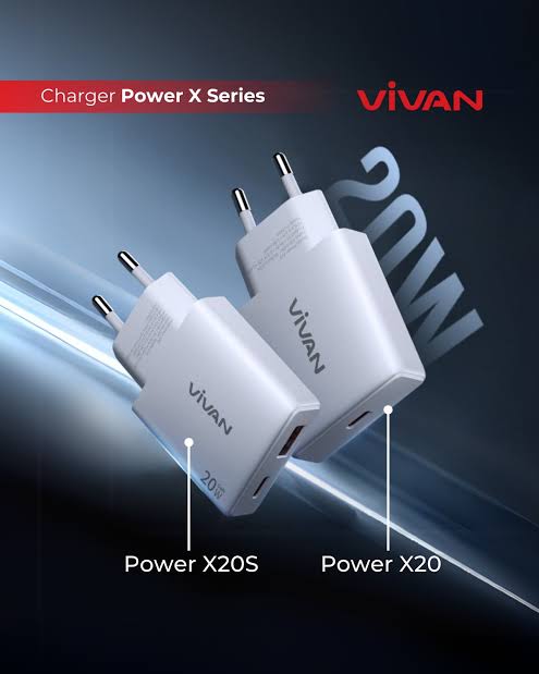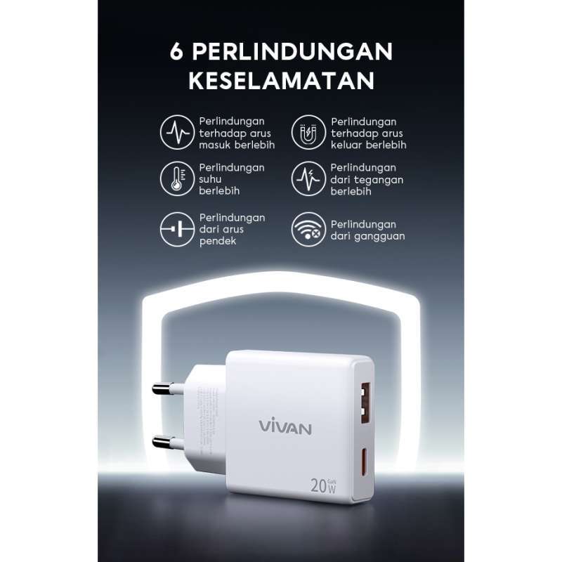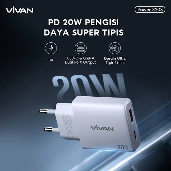 - Merek: Vivan - Model: Power X20S - Input: 100-240V 50/60Hz 0.5A Max - Output USB-C: 5V/3A, 9V/2.22A, 12V/1.67A (20W) ; PPS: 3.3-5.9/3A, 3.3-11V/1.8A - Output USB-A: 5V/3A, 9V/2A, 12V/1.5A (18W) - Output C+A: 5V/3A (15W)