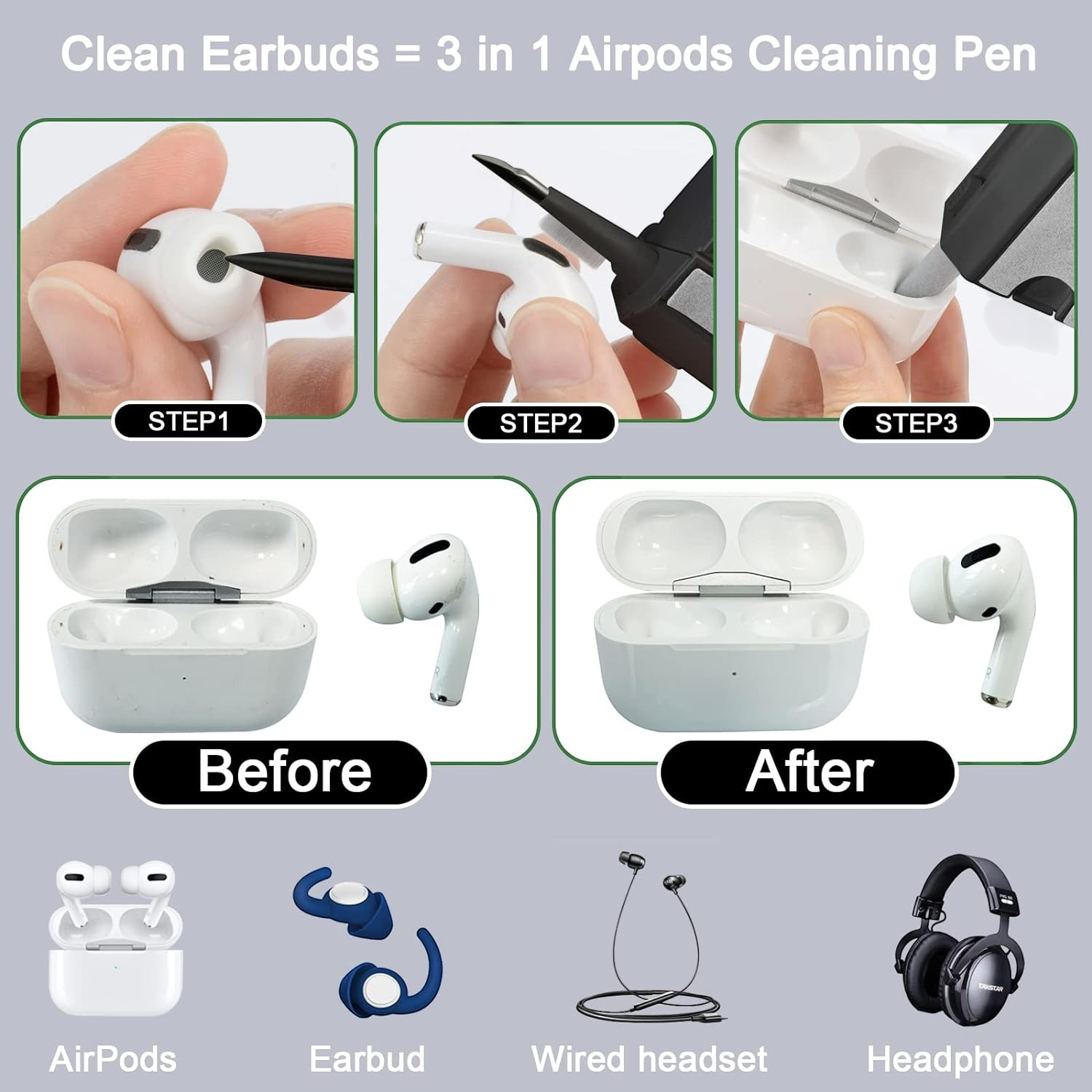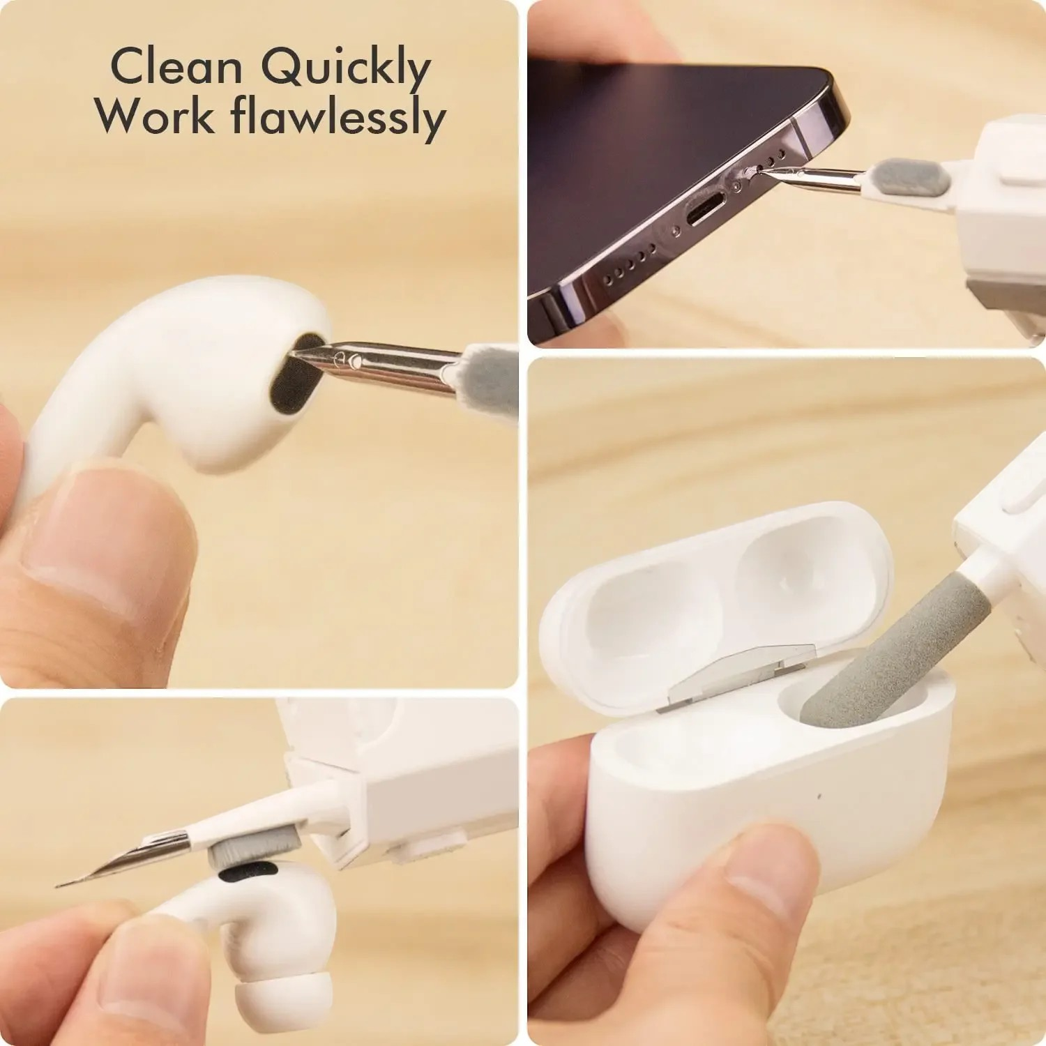 Earphone sering kali luput untuk dibersihkan padahal kebersihannya penting untuk telinga Anda. Kini Anda tak punya alasan lagi untuk tak membersihkan earphone milik Anda. Gunakan nib yang memiliki ujung lancip untuk membersihkan bagian earplug. Terdapat sikat lembut yang bisa Anda gunakan untuk membersihkan earphone dari debu. Cotton swab yang lembut bisa Anda gunakan untuk membersihkan earphone case.