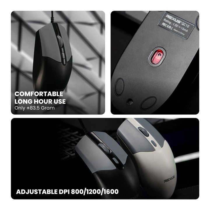 Rexus Wired Office Mouse QC10 Lightweight Essential Rexus QC10 hadir sebagai mouse berkabel dengan koneksi stabil untuk menunjang produktivitas tanpa hambatan. Tangguh hingga 3 juta klik, dilengkapi 4 tombol fungsional yang responsif dan nyaman digunakan. Dengan bobot ringan ±83,5 gram dan DPI yang dapat disesuaikan (800/1200/1600), QC10 menawarkan kenyamanan ergonomis dan kontrol presisi untuk penggunaan jangka panjang. Stable Wired Connection Built to Last - 3 Million Clicks Adjustable DPI 800/1200/1600 4 Functional Buttons Comfortable Long Hour Use, Only ±83.5g DESKRIPSI FUNGSI Tombol Kiri Tombol Kanan Roda Gulir/ Tombol Tengah Tombol DPI CATATAN: Lampu tidak bisa dinonaktifkan