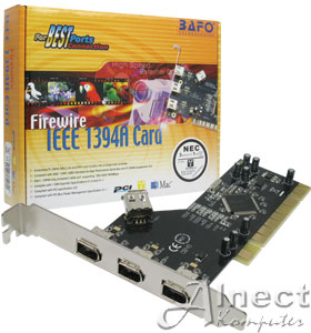 Kartu PCI keluaran BAFO yang di desain khusus buat internal PC Desktop, digunakan untuk media capture video dari perekam video (camcorder) dengan berbagai aplikasi software capture/editing standard (optional) melalui koneksi kabel firewire. Terintegrasi chipset dari NEC buatan Jepang kartu PCI firewire ini sudah terbukti kemampuannya dalam kecepatan data transfernya.