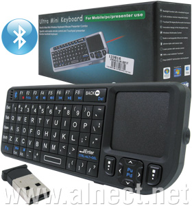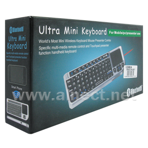Ultra Mini Keyboard for Mobile/PC/Presenter Use, Mini Wireless Keyboard Mouse Presenter Combo, Toucpad Presenter Function Handheld Keyboard, Wireless Bluetooth Connection, Smart and Portable Size, To Enjoy PC Multi-Media Entertainment at Home, Convenient and Efficient for Conference/Presentation and Lecturing, Share Large TV and Projector Screen, Built-In Large PAD for Handwrite, Backlight Function with a Handheld Keypad, Toucpad 90-Degree Flip, Windows Multimedia Control, iPhone Style Craft Classic Style, Built-In Lecture Laser Pointer with Remote Control, Real QWERT Full-Function Mini Keyboard, Built-In Rechargeable Li-Ion Battery, DC 5V USB Battery Charging.