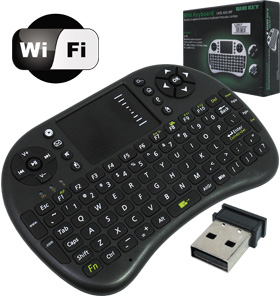 Sebuah perangkat keyboard berukuran mini yang dapat dihubungkan ke komputer secara nirkabel (RF 2.4GHz Wireless) menggunakan receiver USB yang sudah disediakan. Keyboard portabel ini sudah dilengkapi dengan papan sentuh (touch mouse) mouse beserta tombol klik kanan dan kiri mirip seperti yang terdapat di notebook yang berfungsi untuk menggerakan kursor di layar laptop atau smartphone/tablet PC bahkan perangkat Smart TV atau Android TV Boxes bahkan game console seperti Xbox 360 dan Sony Play Station 3. Keyboard mini ini dilengkapi juga tombol-tombol hotkeys untuk fungsi multimedia lengkap dengan tombol Function (F1-F10) dan tombol direction serta tombol QWERT lengkap mirip seperti keyboard komputer. Keyboard ini bertenagakan baterai lithium yang dapat diisi ulang melalui port USB dan dilengkapi USB Wireless receiver berbentuk kecil yang dapat dimasukkan kedalam bodi-nya sehingga lebih mudah dibawa-bawa.