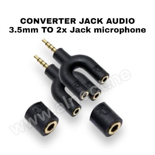 Splitter U Shape Splitter Jack 3.5mm Male ke Dual Female Microphone dan Microphone. Dengan ini Anda dapat menghubungkan 2 buah microphone ke laptop / PC / gadget Anda.